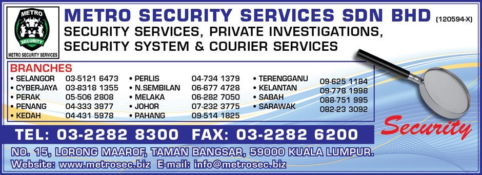 Metro security service sdn bhd Kuala Lumpur Kuala Lumpur NO15 LORONG MAAROF TAMAN BANGSAR 59000 KUALA LUMPUR View on Map. Our team of technicians fleet of service trucks fabrication shops and parts warehouses are equipped to meet your SLAs and serve multi-site portfolios with consistency and quality. Metro Security Services Sdn Bhd has been established since 1991.